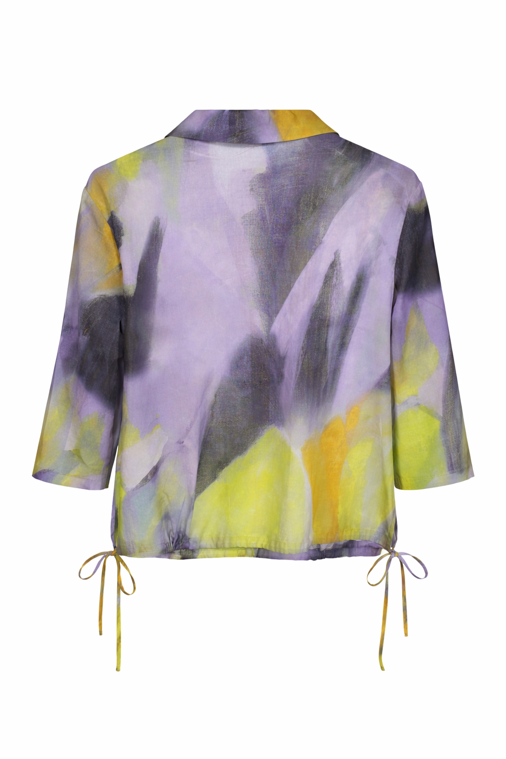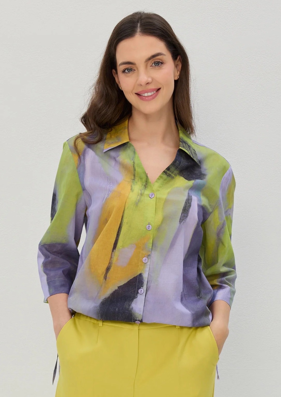Bawełniana koszula w soczystej kolorystyce odcieni fioletów i cytrusów. Dekolt z kołnierzykiem.Zapinana na guziki. Klasycznie wszyte rękawy długości 3/4 z możliwością wywinięcia mankietu. Model odstawiony od sylwetki. Na dole koszuli tunel z wiązaniem,co ułatwi dopasowanie objętości koszuli. Tył gładki. Koszula ma charakter dzienny,do pracy lub na wyjątkowe okazje. Do skompletowania ze spodniami w cytrynowej lub liliowej kolorystyce o numerze 25/77.