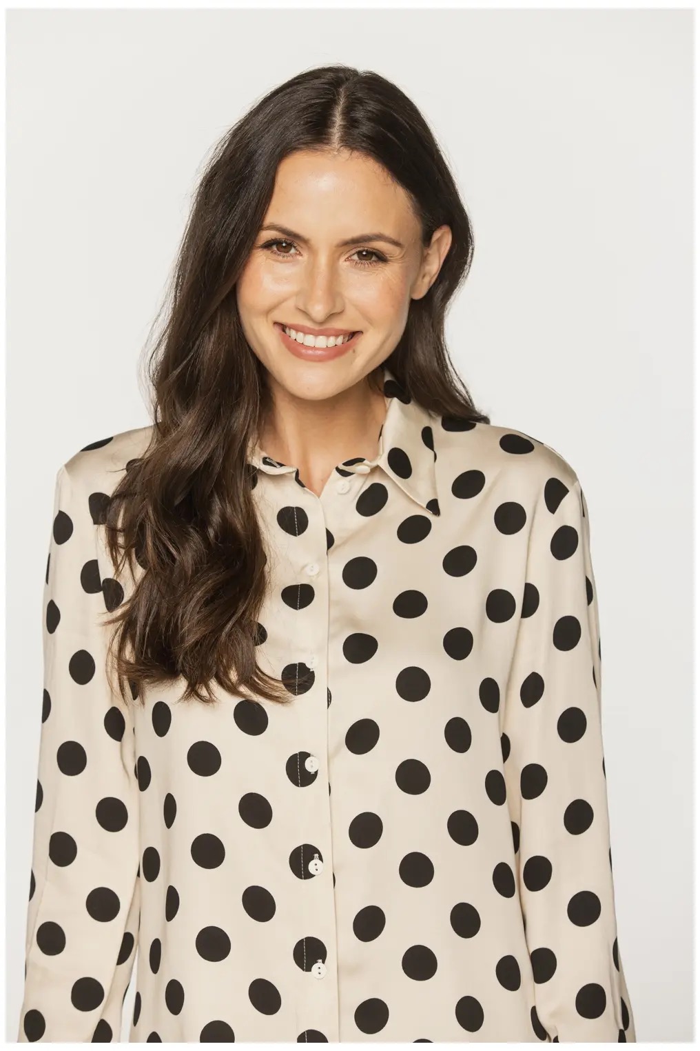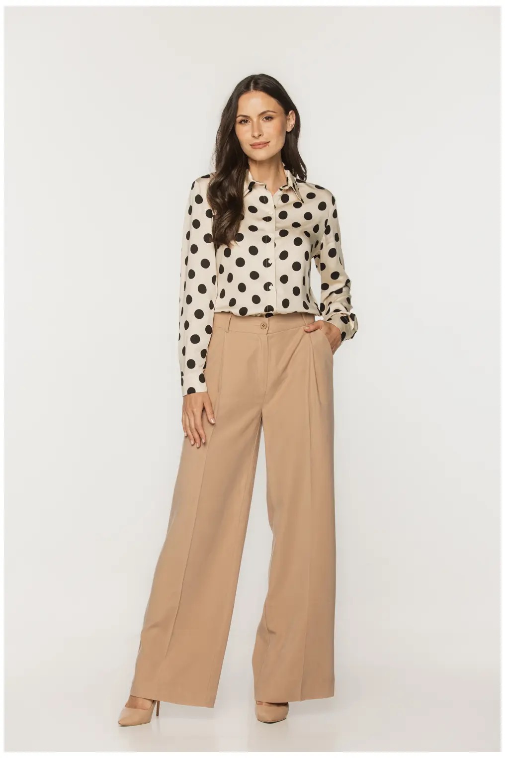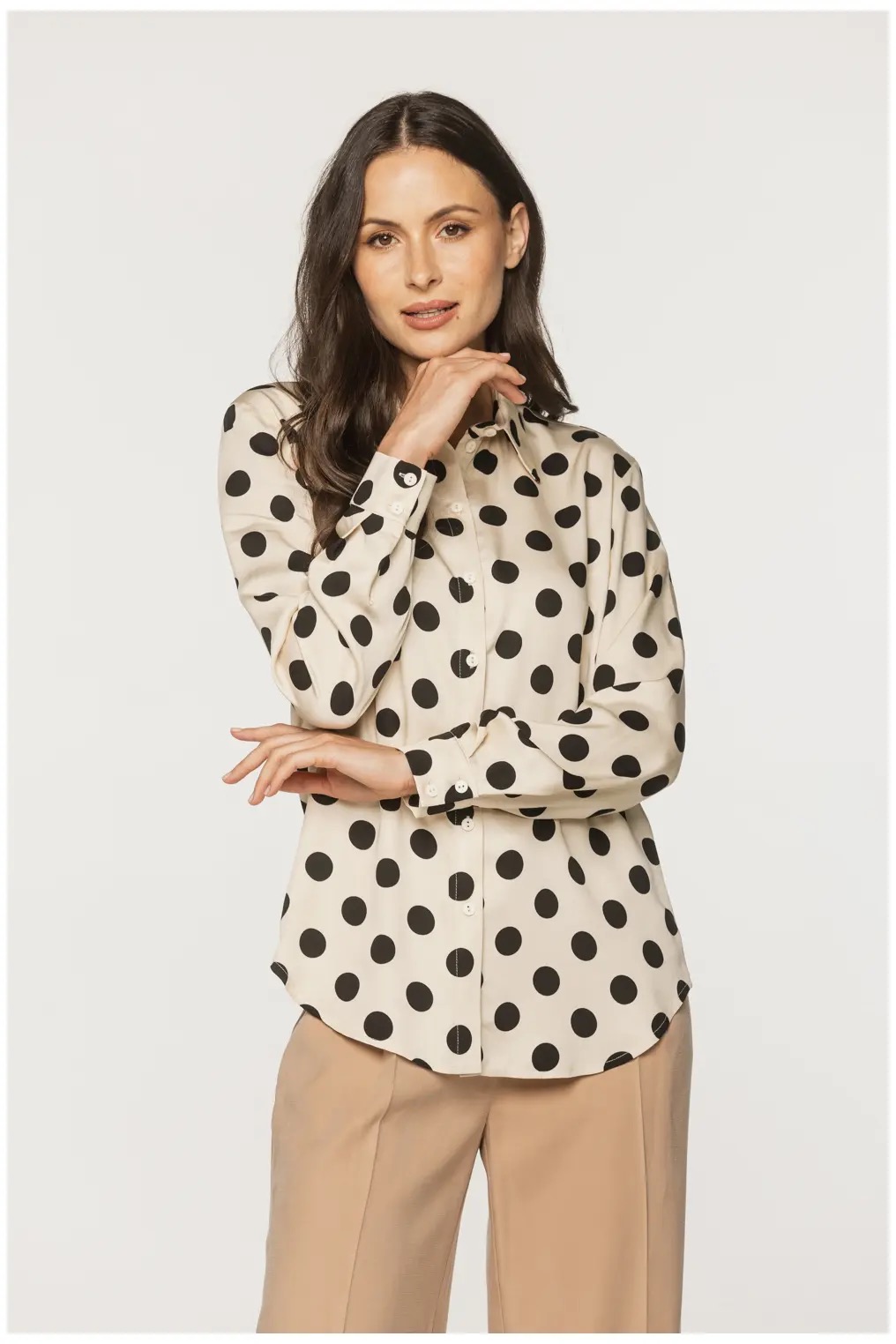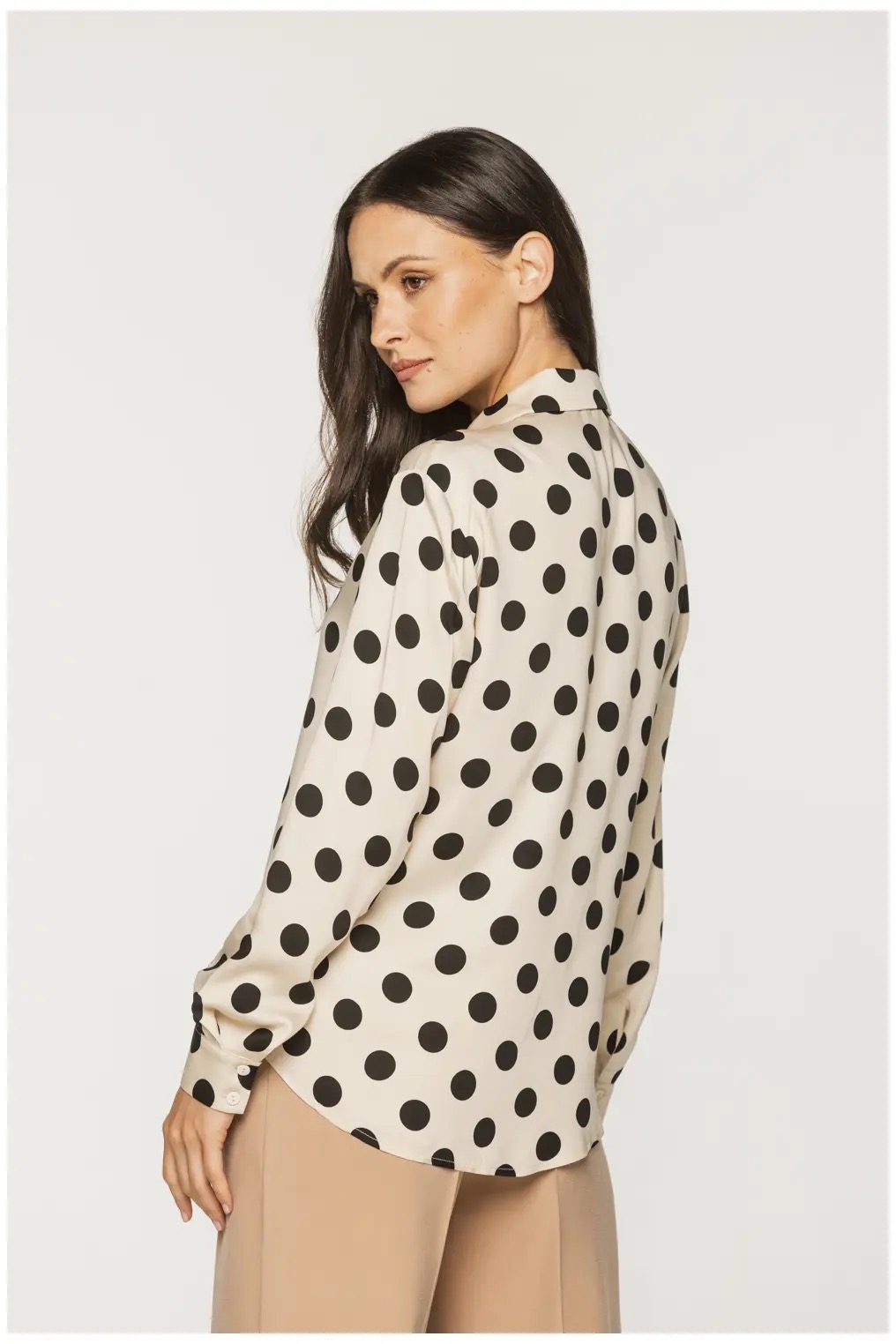 Beżowa koszula bialcon w czarne duże grochy