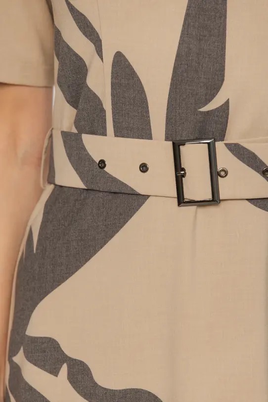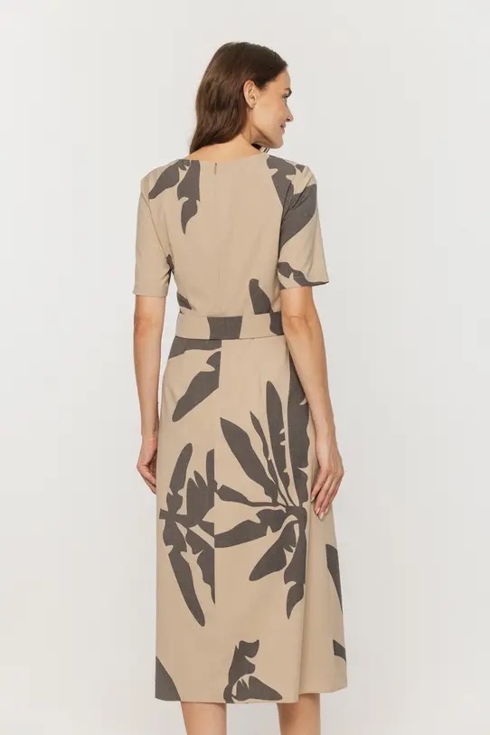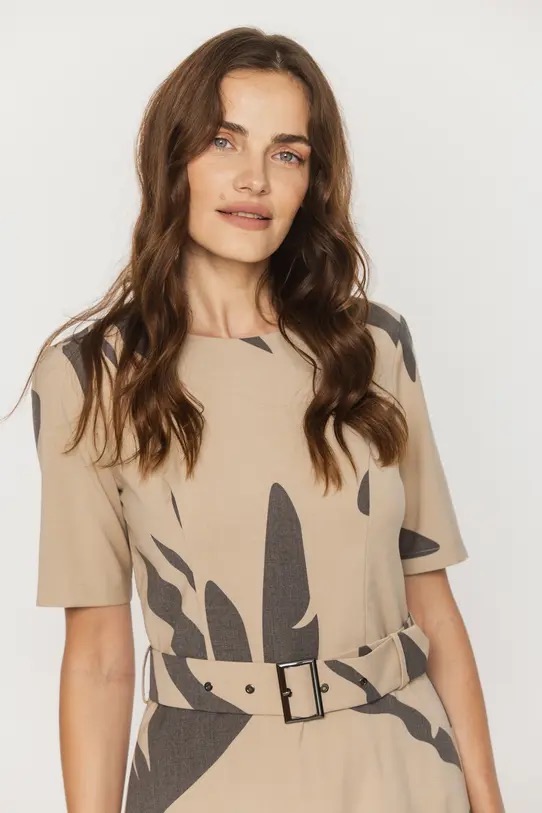 Beżowa sukienka wiskozowa w ciekawej kolorystyce, sukienka posiada pasek.