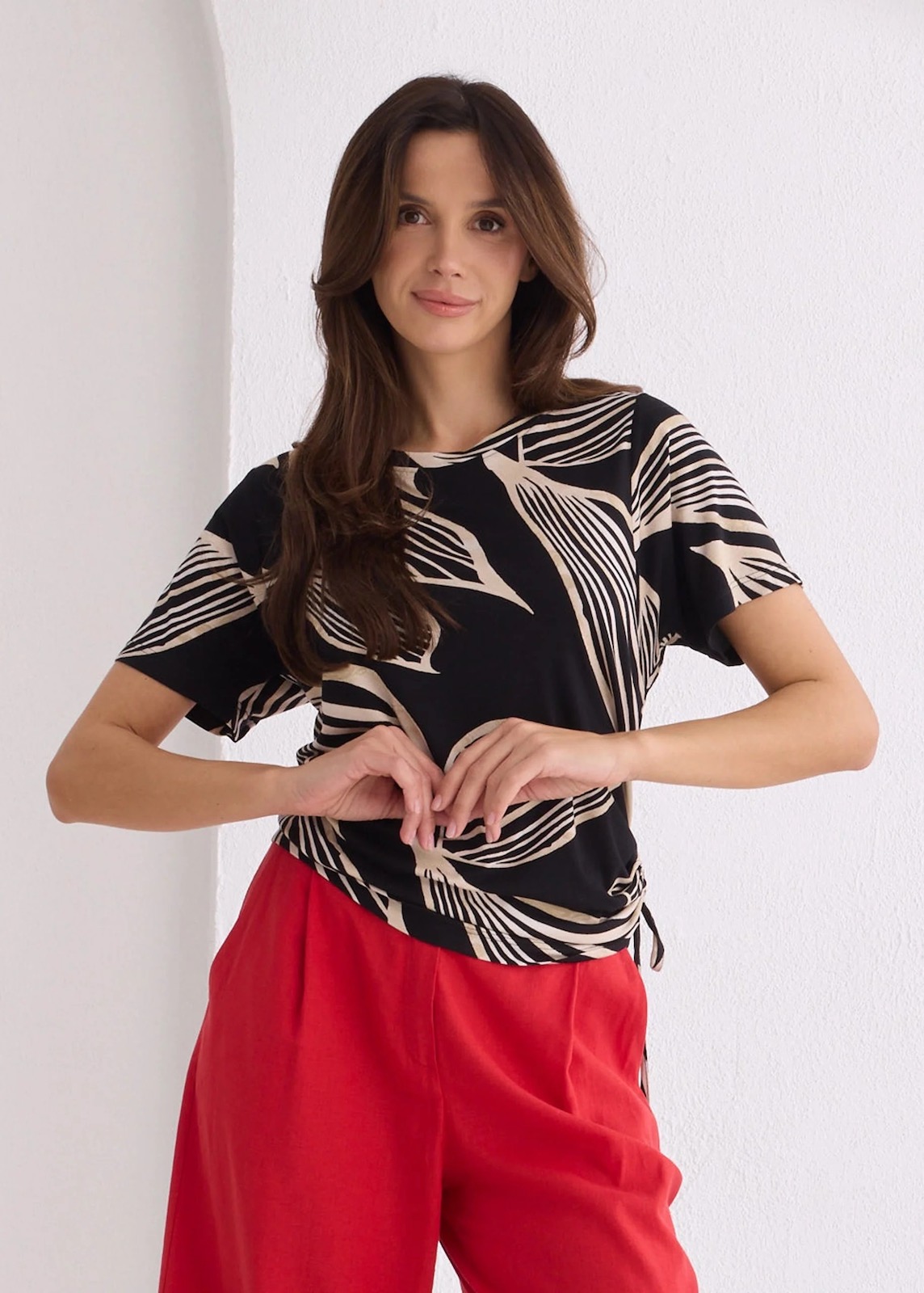 Wiskozowa bluzka w kontrastowy, geometryczny piaskowy wzór liści na czarnym tle. Okrągły, pogłębiony dekolt z przodu. Krótki rękaw i pogłębiona pacha. Fason swobodny, odstawiony od sylwetki. Z lewej strony w szwie bocznym tunel z wiązaniem z możliwością zmarszczenia boku bluzki. Model dzienny, letni, do wielu stylizacji. Do skompletowania ze spodniami z tej samej tkaniny o numerze 26/86.