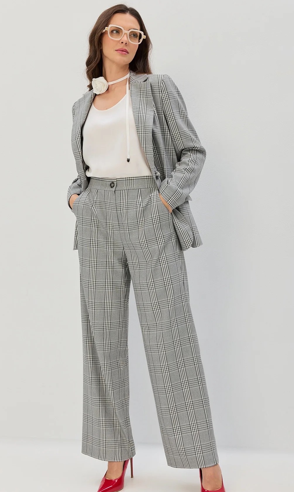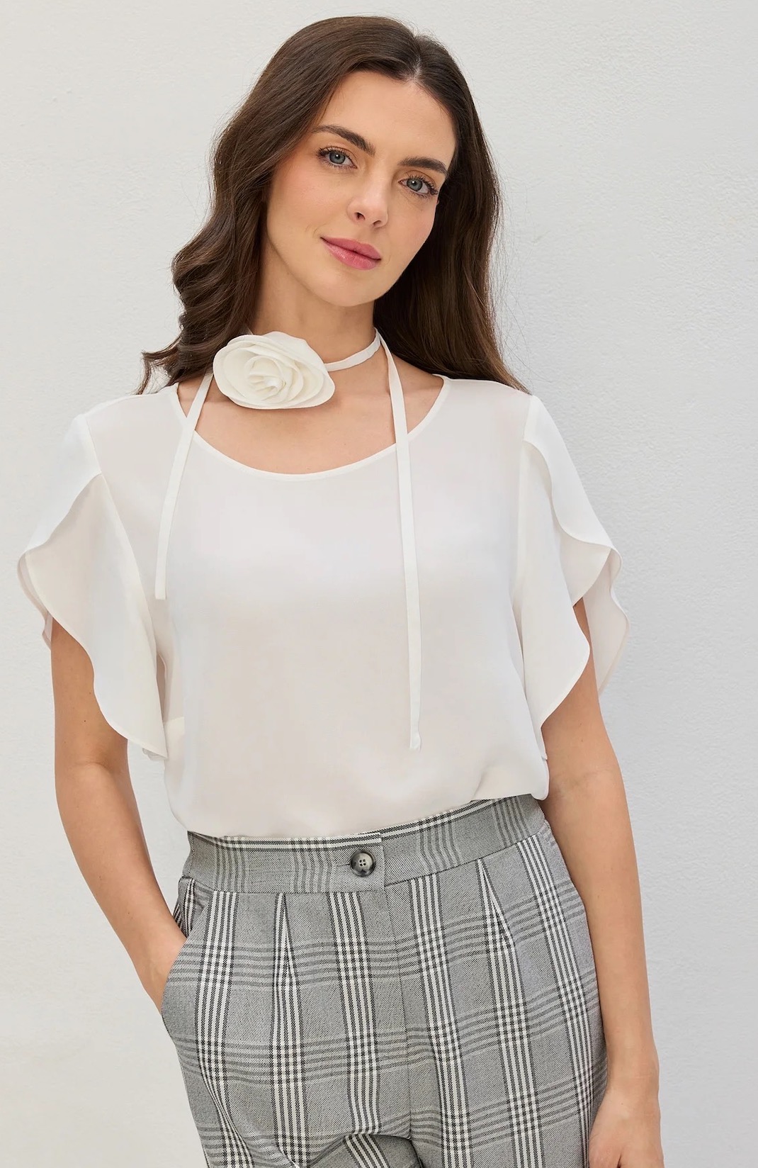 Wiskozowa bluzka z krótkim rękawem i dekoltem typu łódka. Fason lekko odstawiony od sylwetki, nie krępujący ruchów. Z przodu zaszewki piersiowe, z tyłu pionowe, modelujące talię. Fantazyjny rękaw.