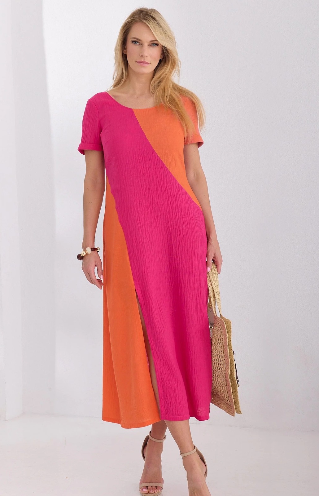 Długa sukienka w kontrastowym połączeniu koloru pomarańczowego i różowego oraz czerwonego. Okrągły dekolt. Klasycznie wszyte krótkie rękawy z małym, wywiniętym mankietem. Lekko taliowana. Rozkloszowany fason dołu. Po prawej stronie z przodu w szwie pęknięcie. Model dzienny, do pracy lub do wykorzystania podczas wakacji.