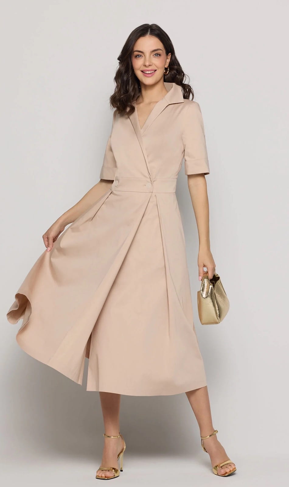 Elegancka beżowa sukienka salko z guzikami