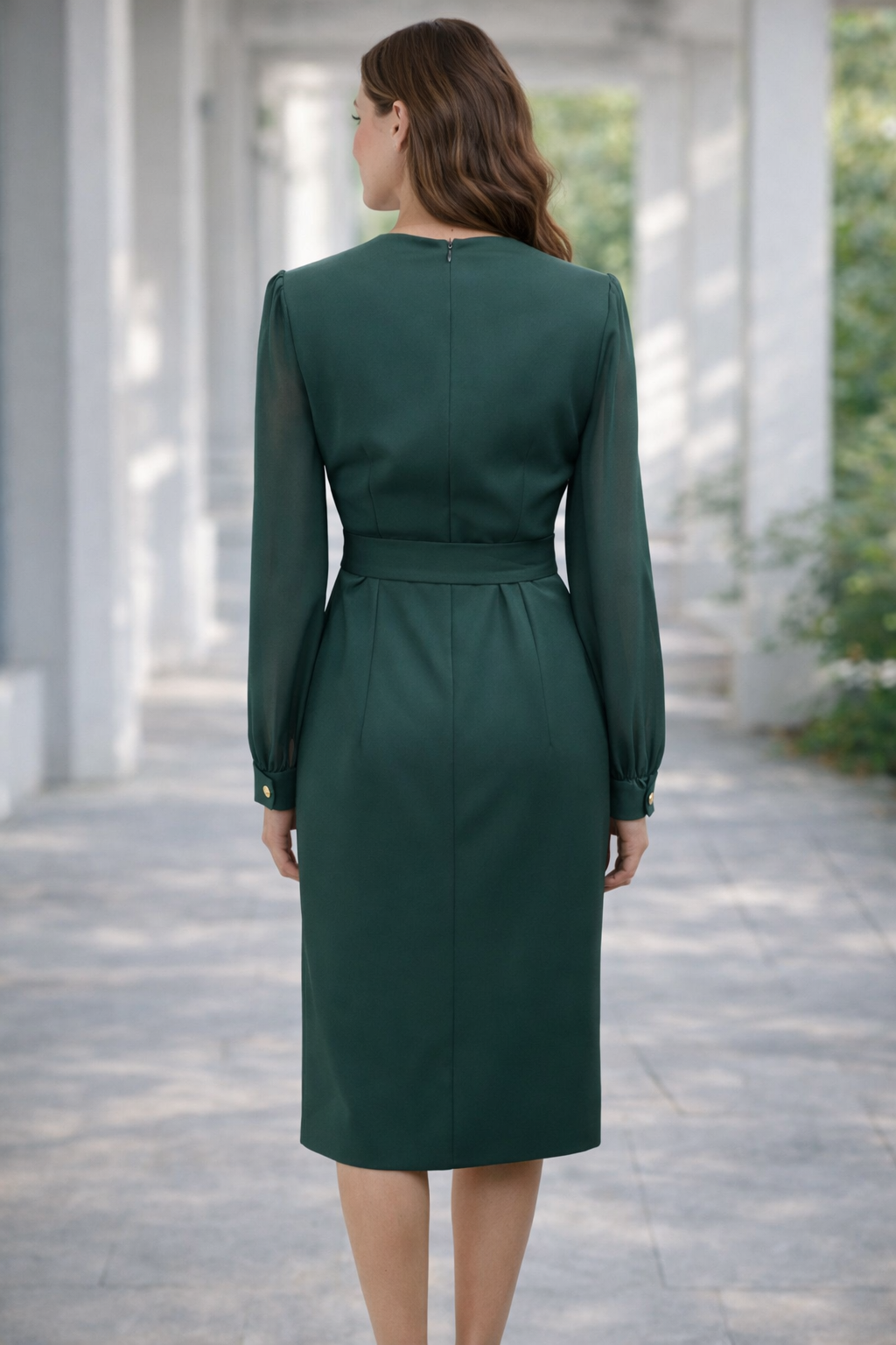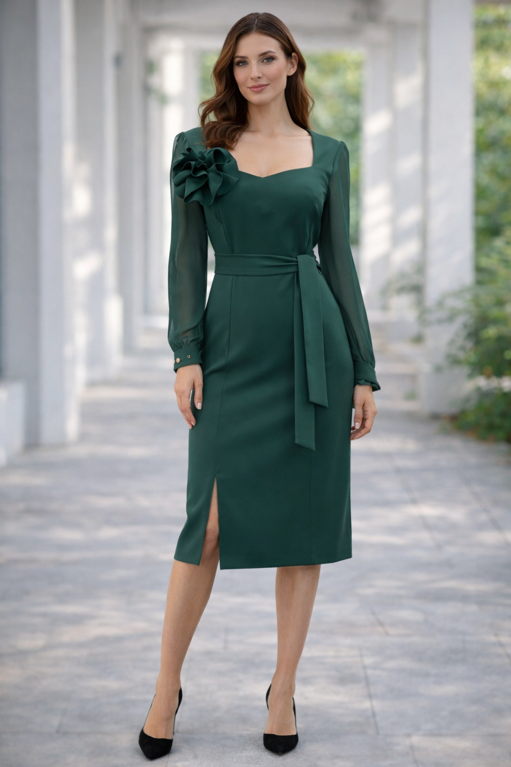 Elegancka zielona sukienka z odpinanym kwiatem
