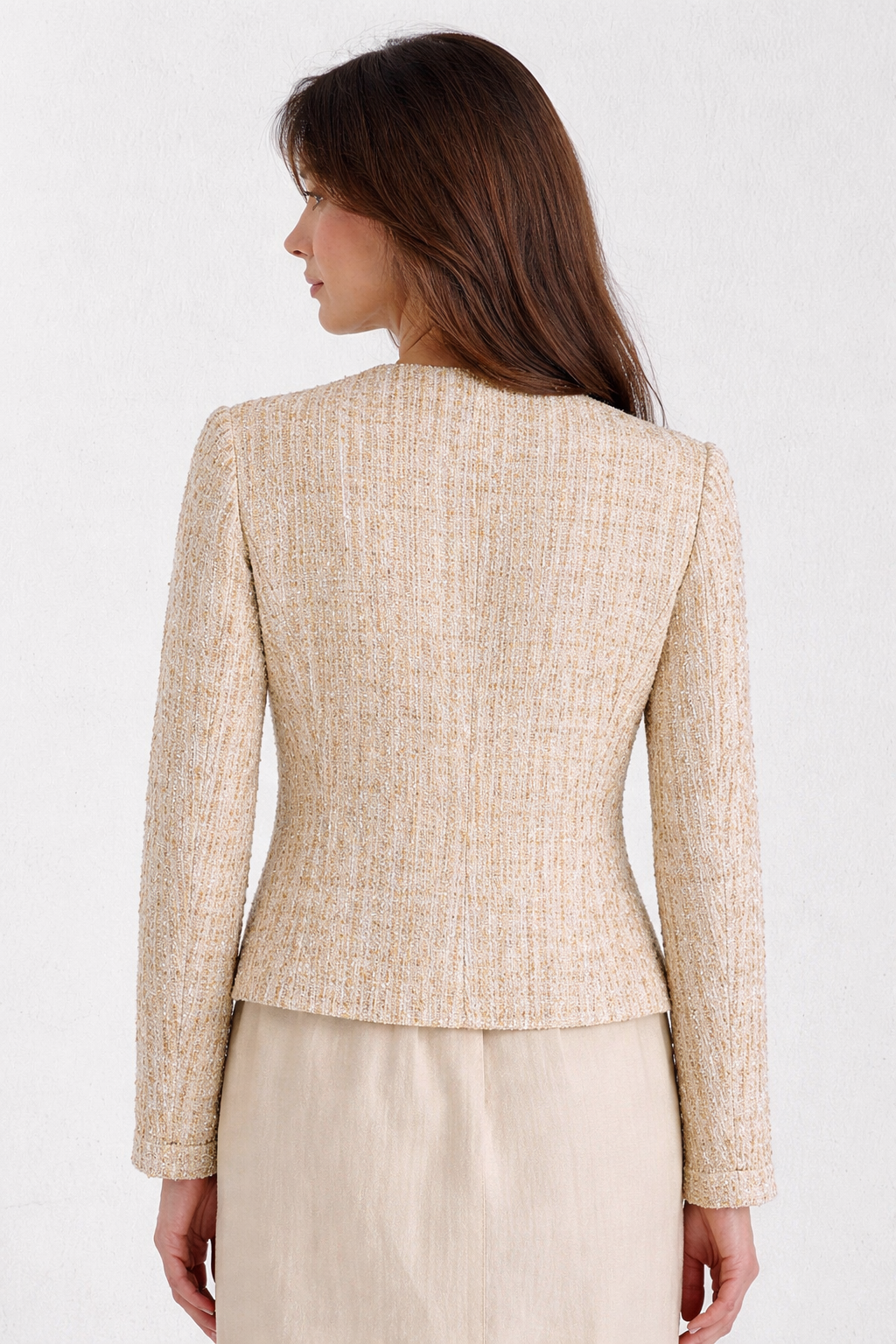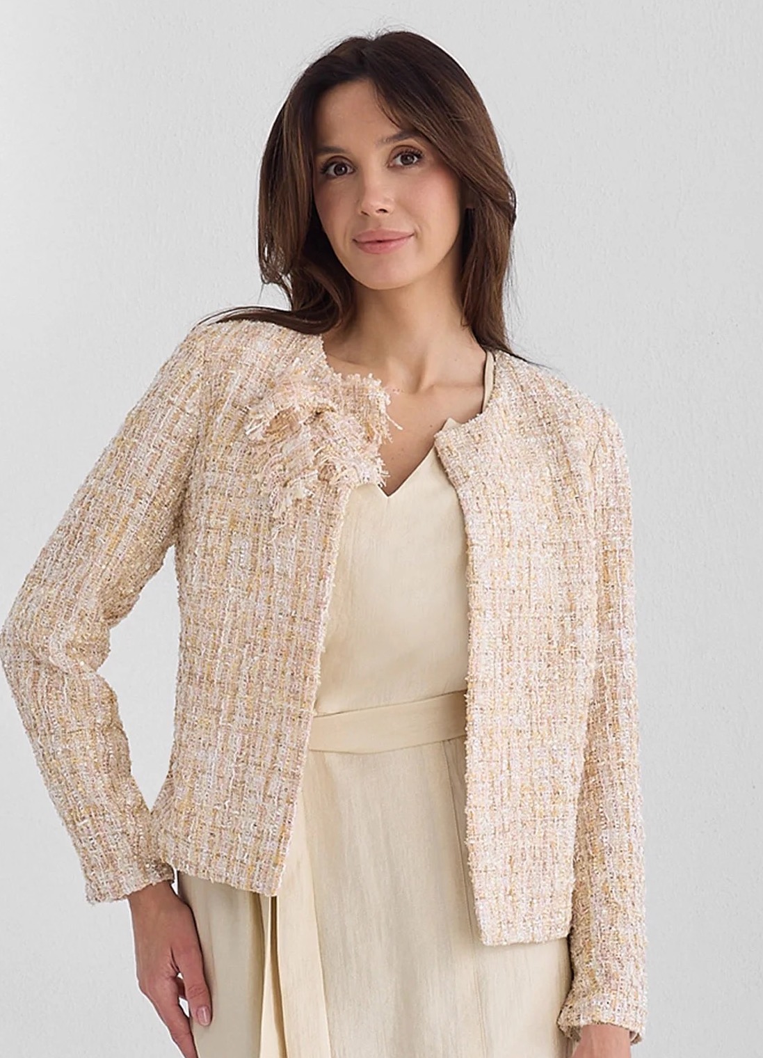 Elegancki żakiet w stylu Chanel ze strukturalnej tkaniny z błyszczącymi nitkami i złotymi cekinami. Dekolt okrągły. Długie rękawy. Fason pudełkowy bez zapięcia. Dołączona dekoracyjna kokarda z tkaniny zasadniczej z możliwością odpięcia.