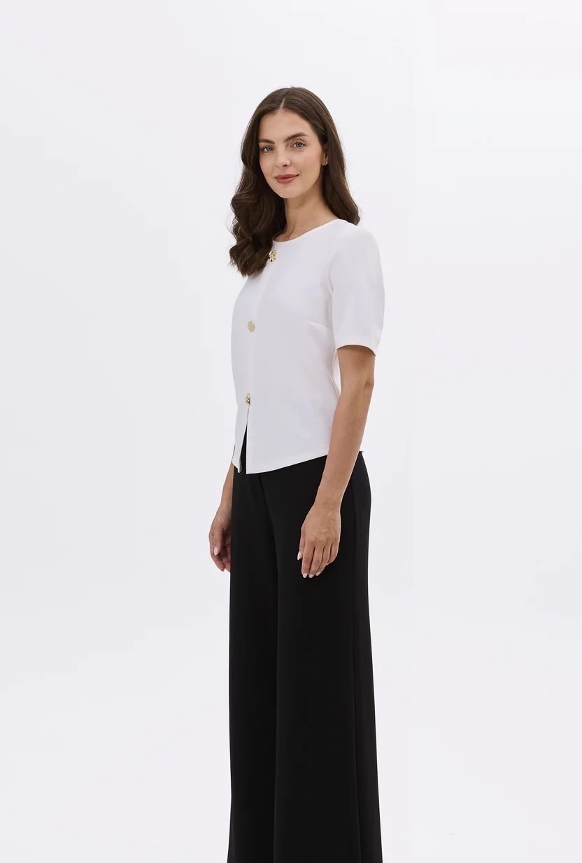 Minimalistyczna, a jednocześnie wyjątkowo elegancka bluzka o prostym kroju z krótkim rękawem. Została ozdobiona efektownymi guzikami w złotym kolorze, które nadają całości szlachetnego wyrazu. Dekolt w łódkę subtelnie podkreśla linię szyi, a lekko taliowany fason pięknie układa się na sylwetce. To idealna baza do wielu stylizacji – zarówno biurowych, jak i wizytowych. Kolor biały i czarny.