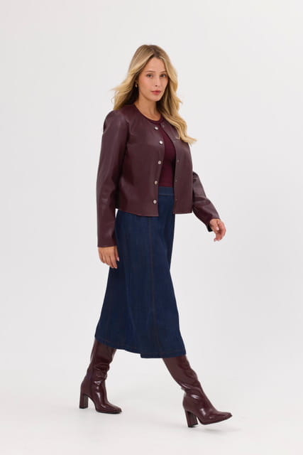Jeansowa spódnica midi o linii A. Kopertowy przód z ozdobnym zapięciem z boku. Zamek kryty pośrodku tyłu. Ozdobne pionowe przeszycia. Ponadczasowy model, który doskonale sprawdzi się w codziennych stylizacjach.