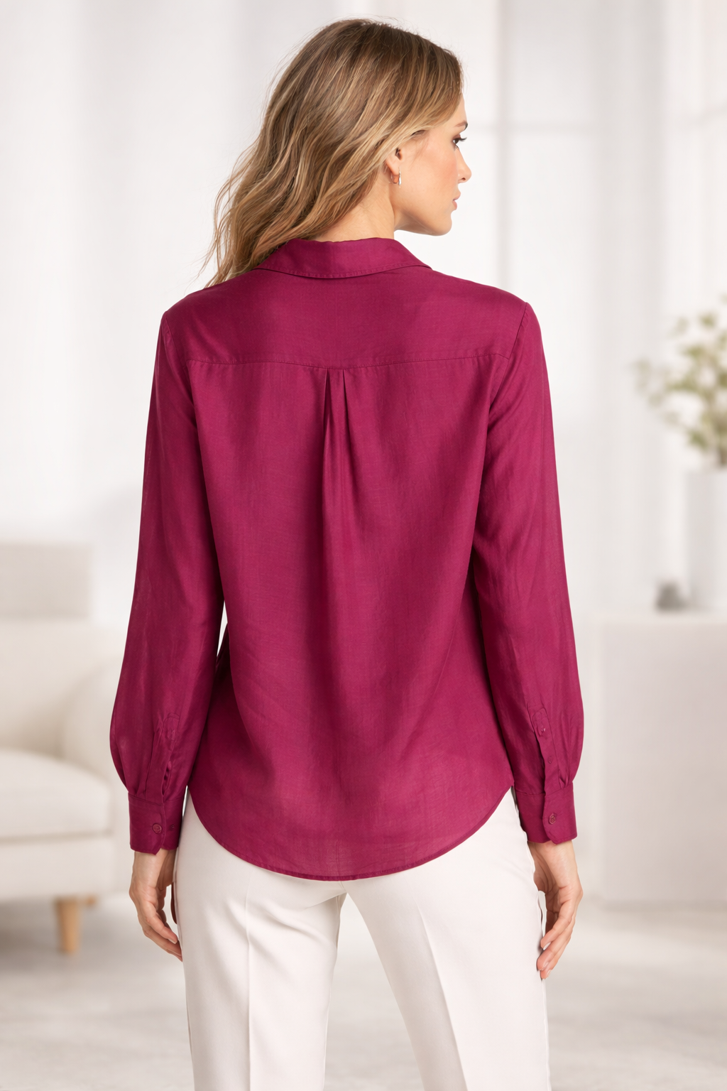 Luźna koszula z delikatnej, lekko transparentnej tkaniny w kolorze bordowym. Forma odstawiona od sylwetki, zapinana na guziki. Klasycznie wszyty rękaw z szerokim mankietem. Ozdobna kieszeń z przodu. Dół zaokrąglony, wydłużony tył. Koszula doskonale sprawdzi się na wiele okazji – zarówno w połączeniu ze spodniami jak i spódnicą.