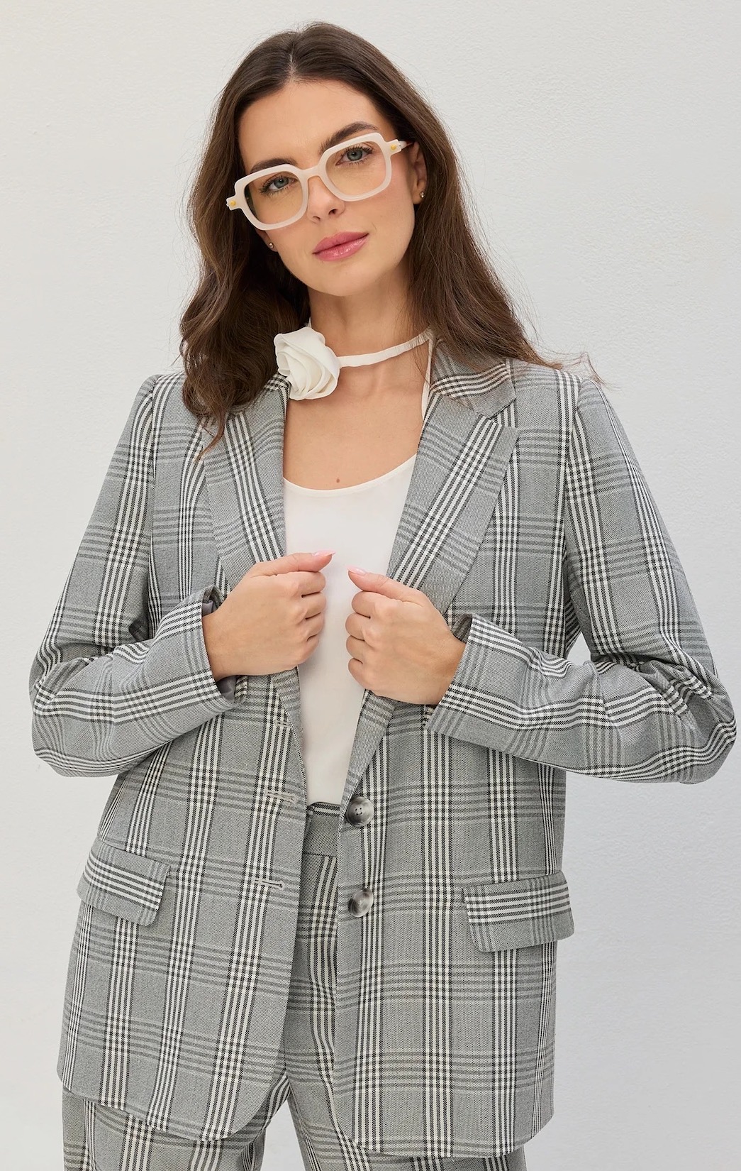 Żakiet w kratę o prostej formie, lekko odstawiony od sylwetki, swobodny w noszeniu. Zapinany na dwa guziki, wykończony podszewką. Kieszenie wszyte są poziomo, zakończone listewką. Z tyłu rozporek umożliwiający swobodę ruchu. Żakiet sprawdzi się biznesowo w połączeniu ze spodniami dostępnymi w kolekcji o numerze 27/7, jak i na bardziej formalne okazje. Popielata kolorystyka tkaniny łączy ponadczasową elegancję z nowoczesnym charakterem.