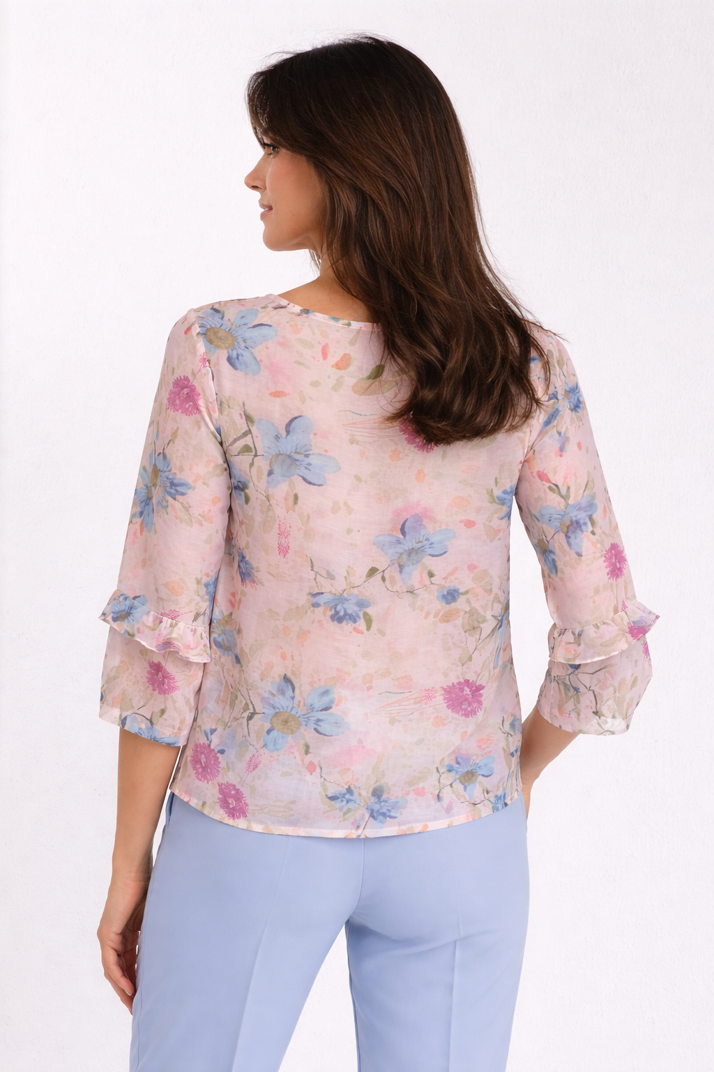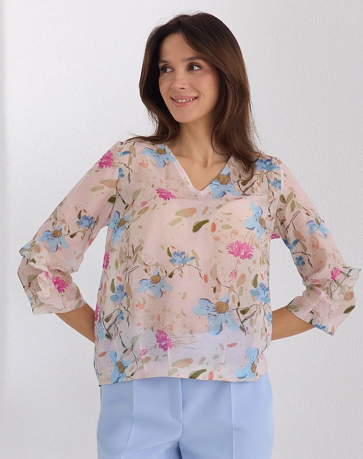 Bluzka w kwiatowy deseń w pastelowej kolorystyce.Dekolt V gładko wykończony. Klasycznie wszyte rękawy długości 3/4 ozdobione delikatnymi falbankami. Fason odstawiony od sylwetki, swobodny. Dół dopasowany małymi zakładkami. Tkanina lekko transparentna. Klasyczna długość. Tył gładki.W kolekcji dostępne kolory dołów dopasowane do motywu roślinnego bluzki.