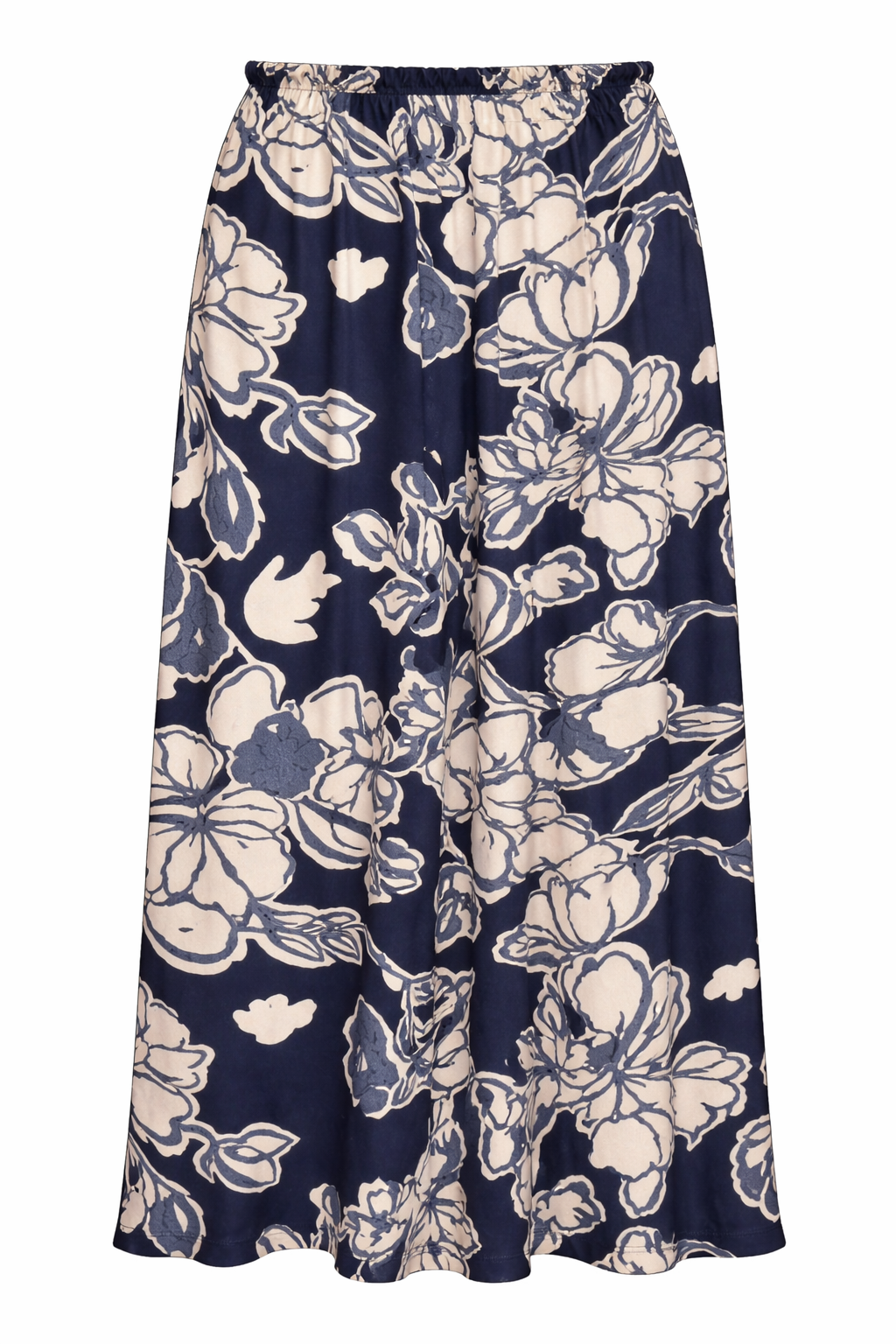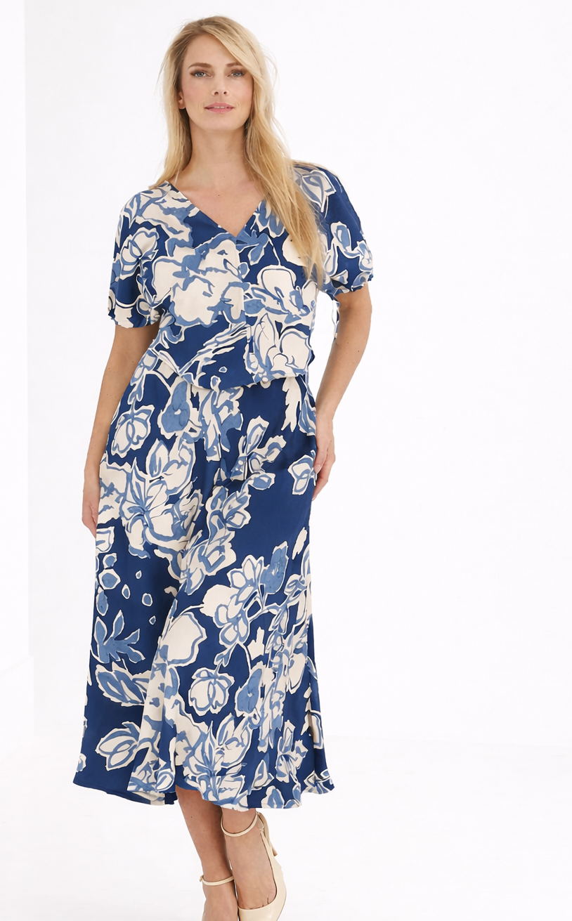 Spódnica midi w roślinny motyw w błękitno-granatowej kolorystyce. Wiskozowa jakość o satynowym wykończeniu. Model rozkloszowany,skrojony ze skosu. Spódnica opływa sylwetkę. Talia wykończona paskiem na gumie. Kieszenie w szwie. Do skompletowania z bluzką z tej samej tkaniny wiskozowej lub gładkimi modelami dostępnymi w kolekcji. Idealna na co dzień lub na wyjątkowe okazje.