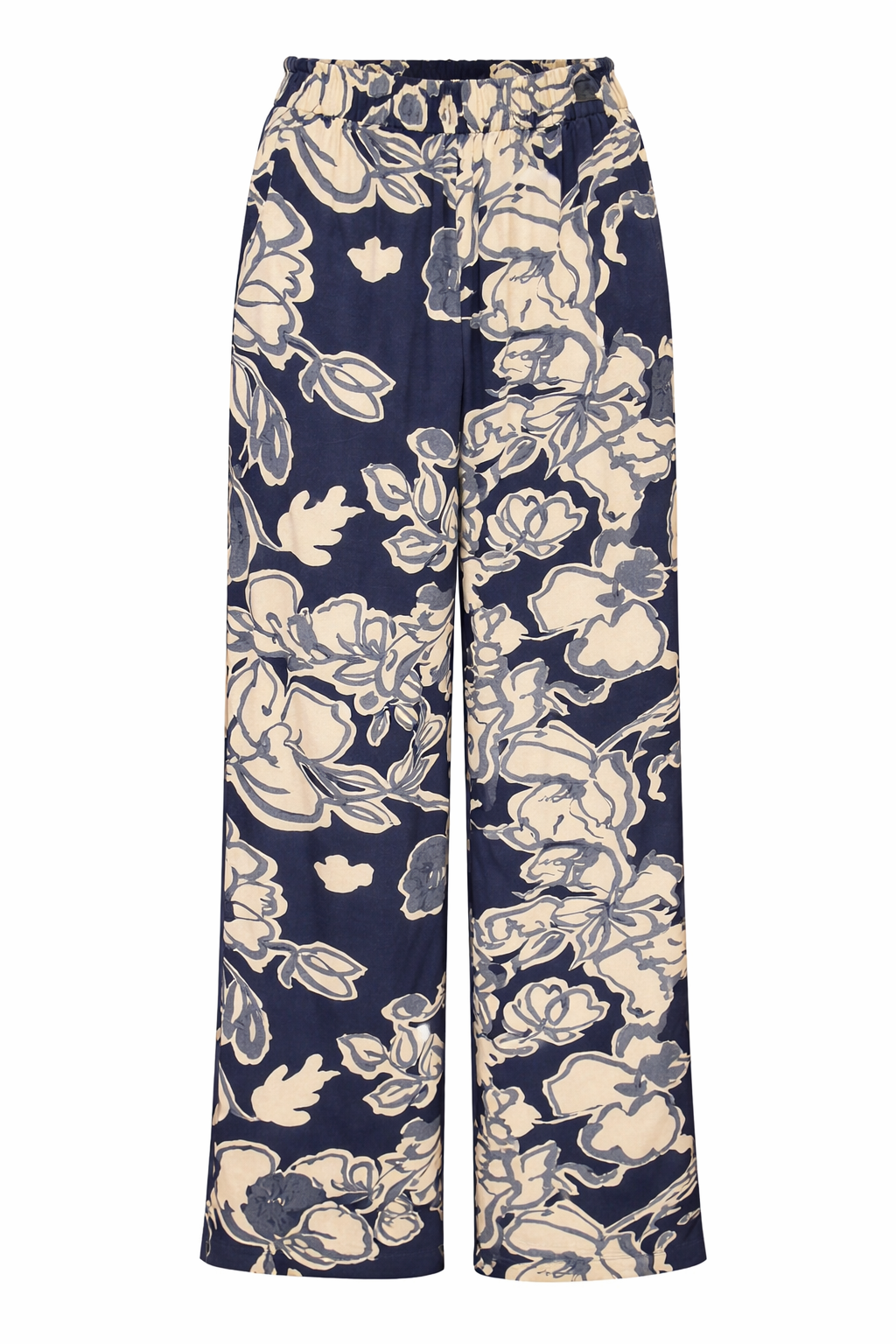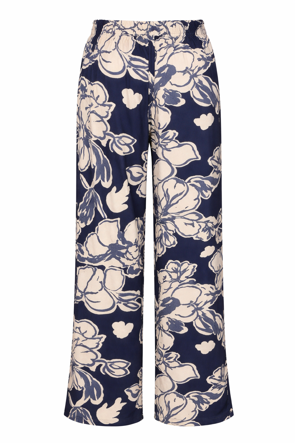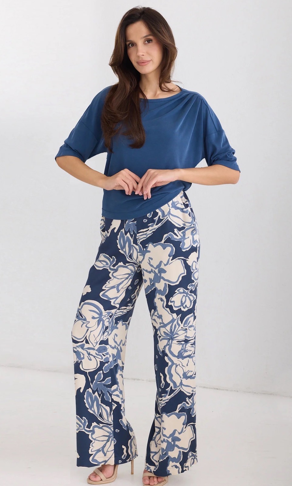 Długie spodnie w roślinny motyw w błękitno-granatowej kolorystyce. Nogawki proste,luźne. Talia wykończona paskiem z gumą. Praktyczne kieszenie boczne. Wiskozowa tkanina z delikatnym satynowym połyskiem miękko układa się na sylwetce i jest przyjemna w dotyku. Spodnie można wykorzystać na wiele okazji. Możliwość skompletowania total look’u z bluzką z tej samej tkaniny o numerze 13/109.