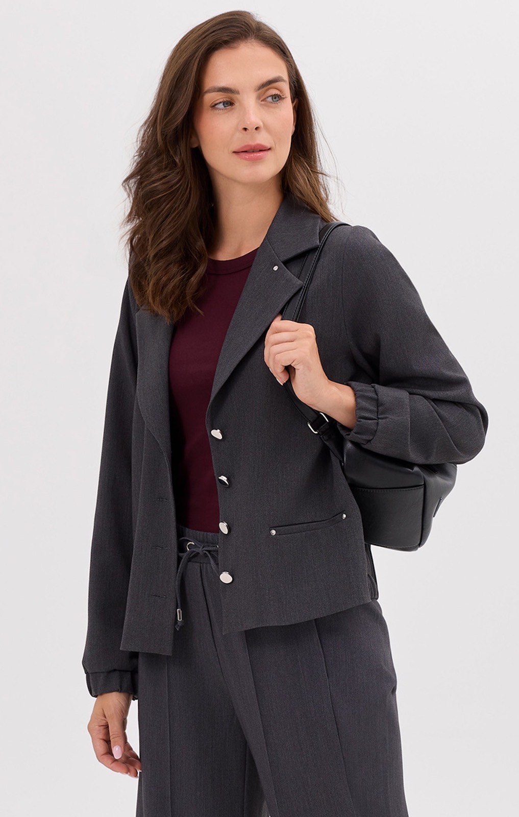 Marynarka sportowa o luźnym fasonie z długim rękawem i klasycznym kołnierzem. Model zapinany na zatrzaski, z atrapą kieszeni oraz gumą w mankietach i u dołu tyłu. Uszyta z gładkiej tkaniny w odcieniu grafitowym. Tworzy komplet ze spodniami z tej samej tkaniny (kod artykułu: 235/5).