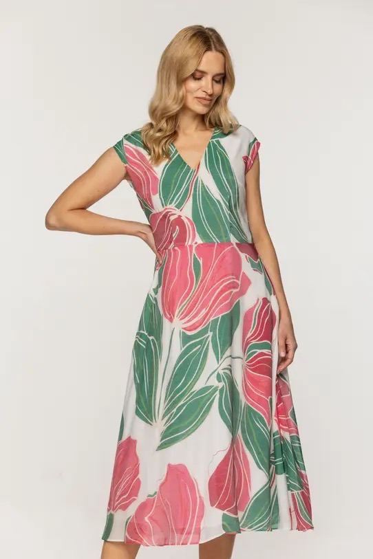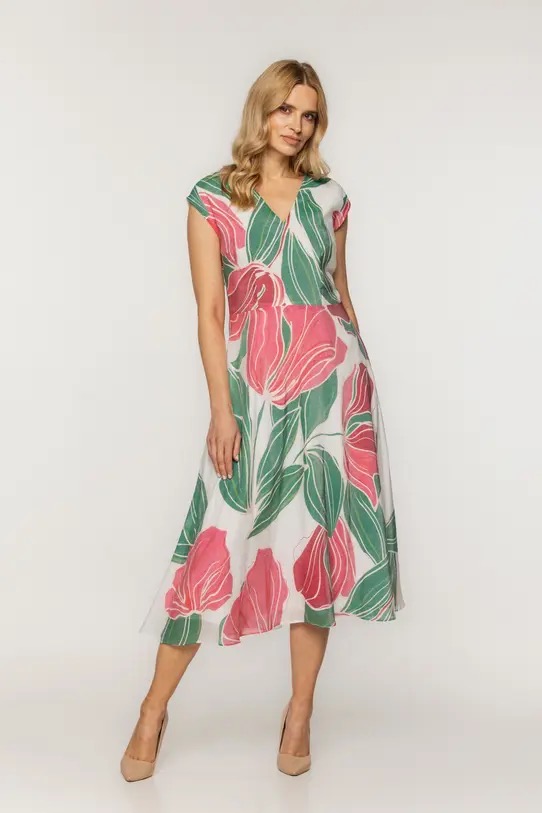 Zwiewna sukienka lekko rozkloszowana, zamek z tyłu, kryty. Podszewka bawełniana, oddychająca.