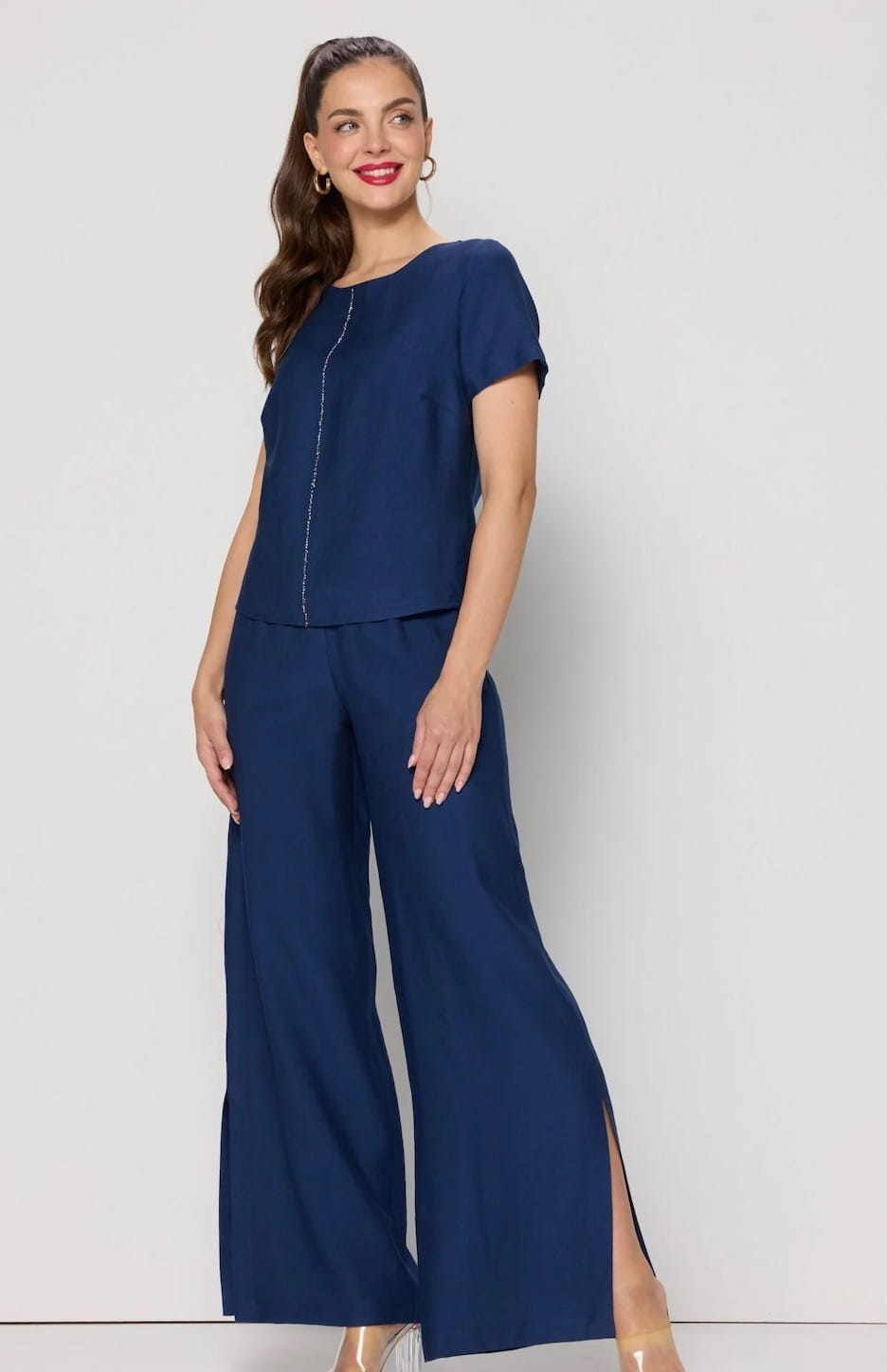 Wiskozowa bluzka granatowa salko z ozdobną taśmą