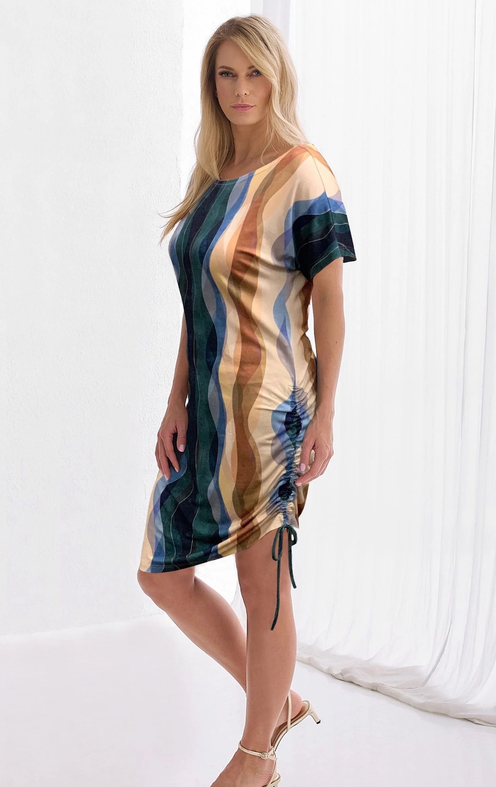 Wiskozowa sukienka letnia w geometryczny wzór. Pogłębiony okrągły dekolt z przodu i z tyłu eksponuje szyję. Opuszczona linia ramion przechodzi w krótki rękaw. Model swobodny o prostej linii. Z lewej strony w szwie bocznym tunel z wiązaniem, dzięki któremu można zmarszczyć bok sukienki. Tył prosty. Tkanina trykotowa, wygodna w noszeniu. Wzór przeplata kolory granatu, szmaragdu, błękitu, beżu i brązu. Do codziennego noszenia lub na wakacyjne wypady.