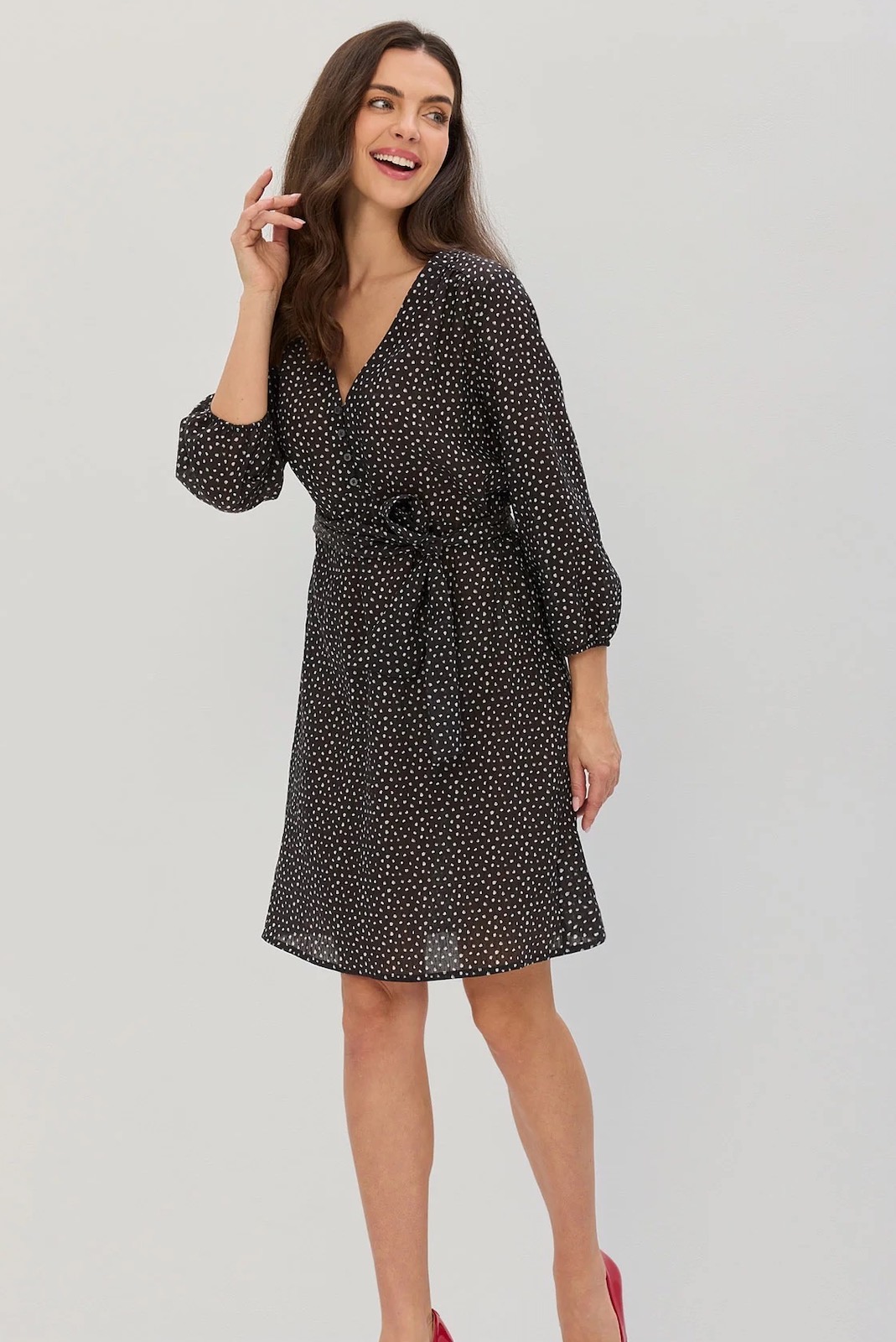 Wiskozowa sukienka w delikatne, białe kropki na czarnym tle. Dekolt V z ozdobnym zapięciem na guziki. Rękawy o długości 3/4 zakończone gumką i marszczeniem. Model w fasonie litery A z delikatnie podkreśloną talią. Dołączony pasek do zawiązania w talii. Długość do kolan. Zaprojektowane i uszyte w Polsce. SKŁAD:
